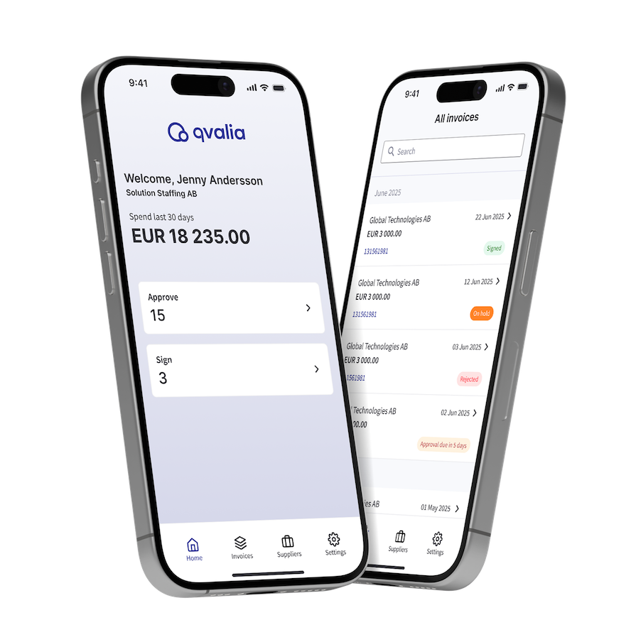 Qvalia-sovellus on saatavilla iPhonelle ja Androidille. Hyväksyjät pysyvät ajan tasalla saapuvista laskuista push-ilmoitusten avulla, pääsevät käsiksi alkuperäisiin laskuasiakirjoihin, voivat tehdä yhteistyötä kommenttien kautta ja suorittaa kaikki työnkulun toimet – kaikki Qvaliassa jo määritetyn hierarkian puitteissa.